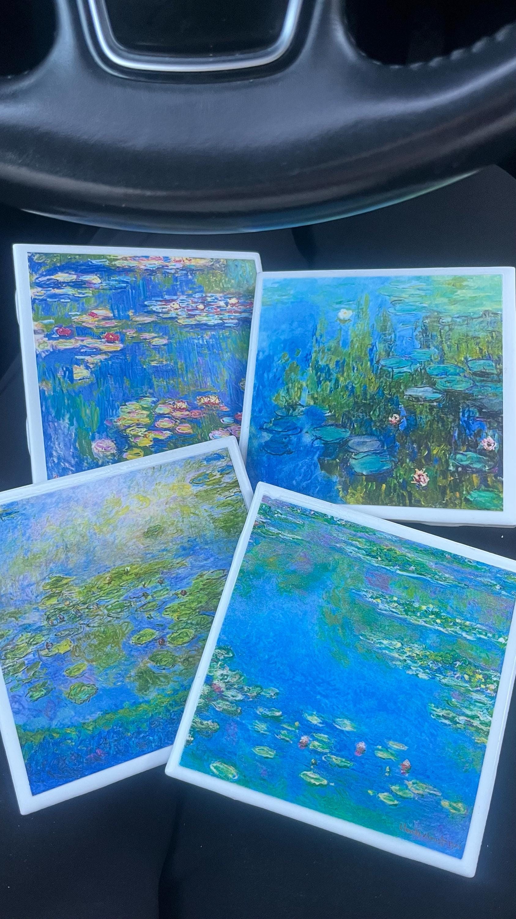 A refined set of four handcrafted ceramic tiles, each featuring an impressionist water lily scene inspired by Claude Monet’s garden paintings. Together, the tiles create a soft visual rhythm—light dancing across water, lilies drifting in calm reflection, and layered brushwork that feels timeless and contemplative.