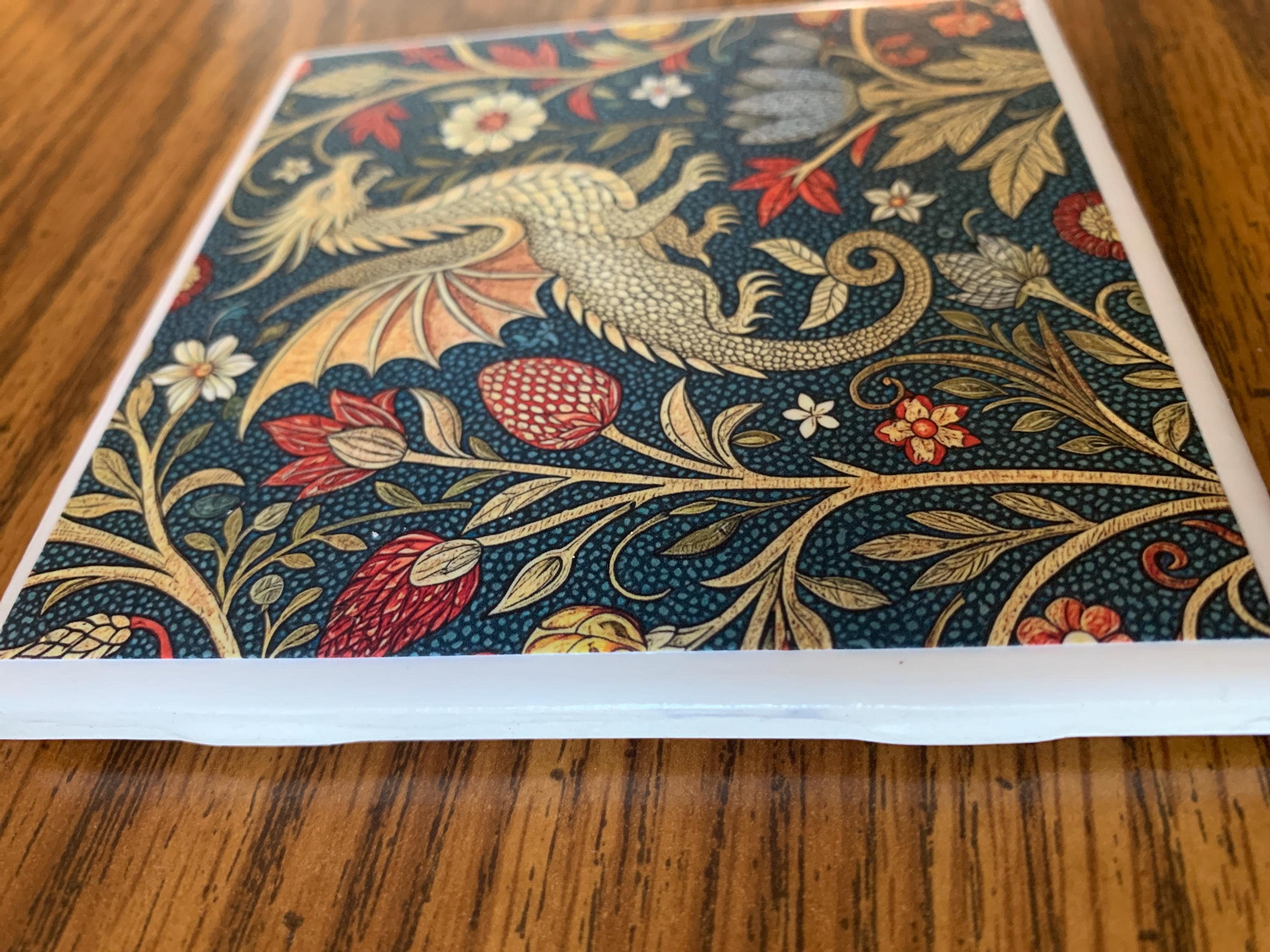 Each ceramic tile/ or slate tile is purchased prior to crafting, my company uses a decoupage method to adhere a print to each tile over several applications. This method takes several days to complete correctly and seal with a water-resistant sealant. My studio has multiple drying racks to allow tiles to dry completely before shipping to your home.