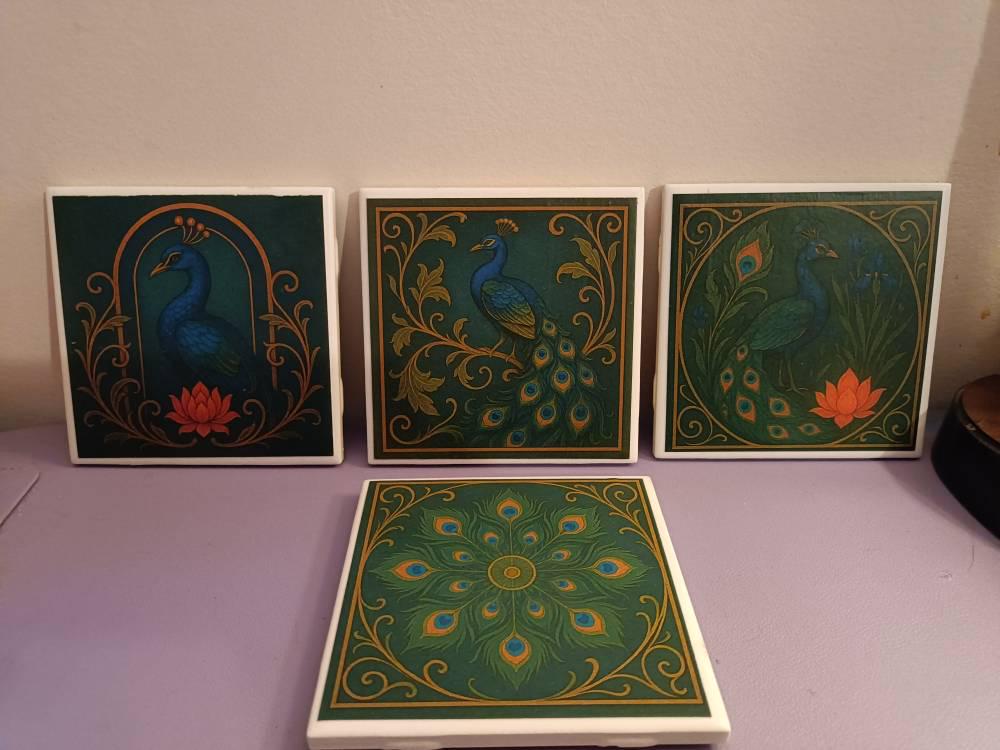 Each ceramic tile/ or slate tile is purchased prior to crafting, my company uses a decoupage method to adhere a print to each tile over several applications. This method takes several days to complete correctly and seal with a water-resistant sealant. My studio has multiple drying racks to allow tiles to dry completely before shipping to your home.